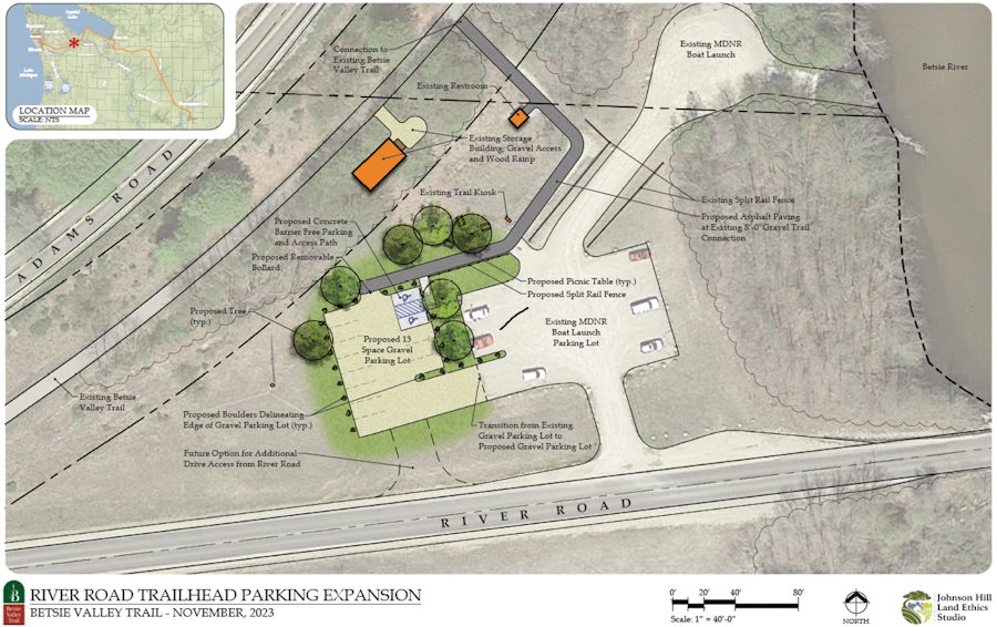 “We worked with both the trails and boating divisions within the DNR and we created a plan upgrade acceptable to both,” stated Jed Maker. “The current gravel space will be transformed to accommodate those with mobility challenges, while complementing the beauty of the Betsie Valley Trail. Included are two paved parking spots for disabled staging and paved walkways, each meeting ADA requirements. One of the parking spots will be designated for boaters accessing the Betsie River. The project will also include the installation of a Huff Cut precast concrete ADA compliant vault toilet. Other aspects of the project include the relocation of the existing entrance off River Road as well as some tree removal, new plantings and other beautification features.”